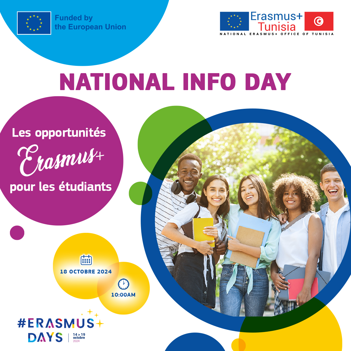 Le Bureau Erasmus+ Tunisie lance un appel pour organiser des sessions d’information sur les programmes Erasmus+ : ICM, Intra-Africa et EMJMD . Des présentations PowerPoint sur le programme Erasmus+ sont à la disposition des intéressés sur les liens suivants : https://www.erasmusplus.tn/Statistiques.php https://www.erasmusplus.tn/virtualexchange.php https://urlz.fr/dPlD https://urlz.fr/dPlA L’objectif de ces sessions d’information est d’informer les parties prenantes des institutions universitaires des opportunités du programme Erasmus+ en Tunisie. Qui peut animer ? enseignant, administratif, étudiant. Dans quelle langue ? AUCUNE contrainte : arabe, français, anglais, autre ! Pour participer à la compétition, cliquer ici pour plus d'informations : https://urlz.fr/e2rD Pour soumettre votre manifestation d’intérêt, prière de suivre le lien suivant : https://forms.gle/bt8xss1zKG1eSqT18 Les candidatures seront sélectionnées selon la qualité de la manifestation d’intérêt soumise. Suite à chaque session d’information organisée, l’organisateur est appelé à soumettre un rapport succinct avec preuves photos et vidéos sur notre e-mail : contact@erasmusplus.tn. Tous les organisateurs de sessions d’informations seront nommés «Ambassadors of Erasmus@Tunisia» et formeront une branche Erasmus@Tunisia dans leurs institutions Universitaires qui sera nommée «XYZ Erasmus@Tunisia Branch» (XYZ représente le sigle de l’institution universitaire). Les meilleurs Ambassadeurs Erasmus@Tunisia dans les trois catégories (enseignant, administratif, étudiant) seront nommés «Councilor of XYZ Erasmus@Tunisia Branch».